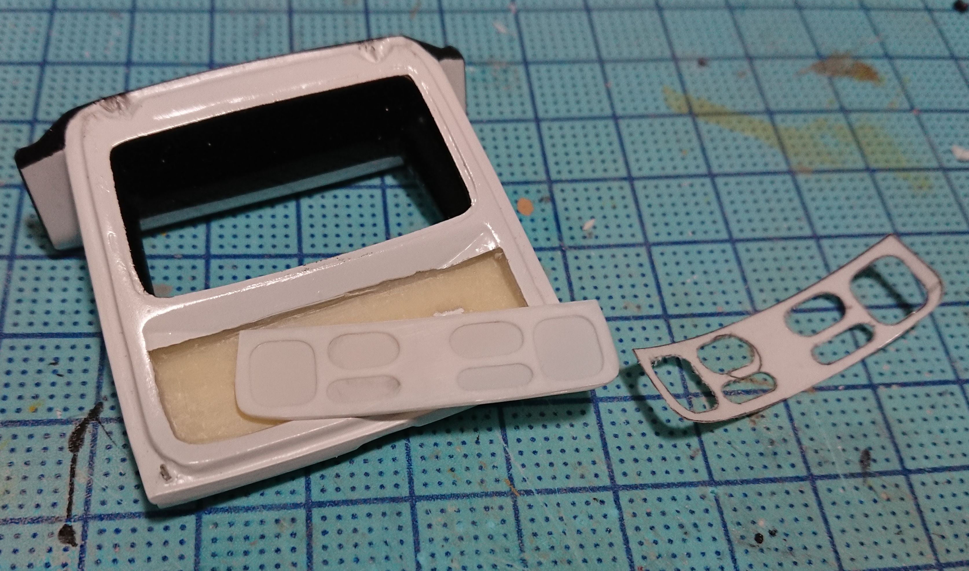 顔の幅を数mm詰めてますのでキットのままでは当然入りません。加工はグリルのモールド部で切断し,①のスリットはエッチング鋸等で切り込みを入れ,上下の幅を詰めます。