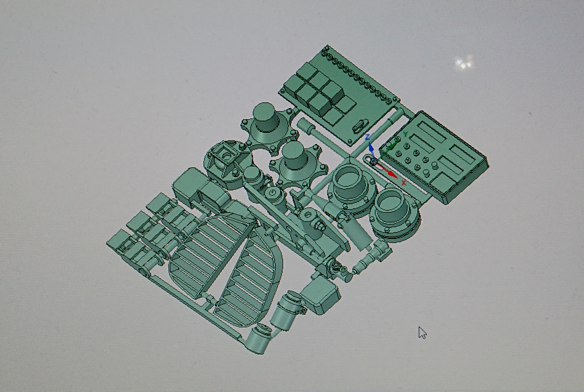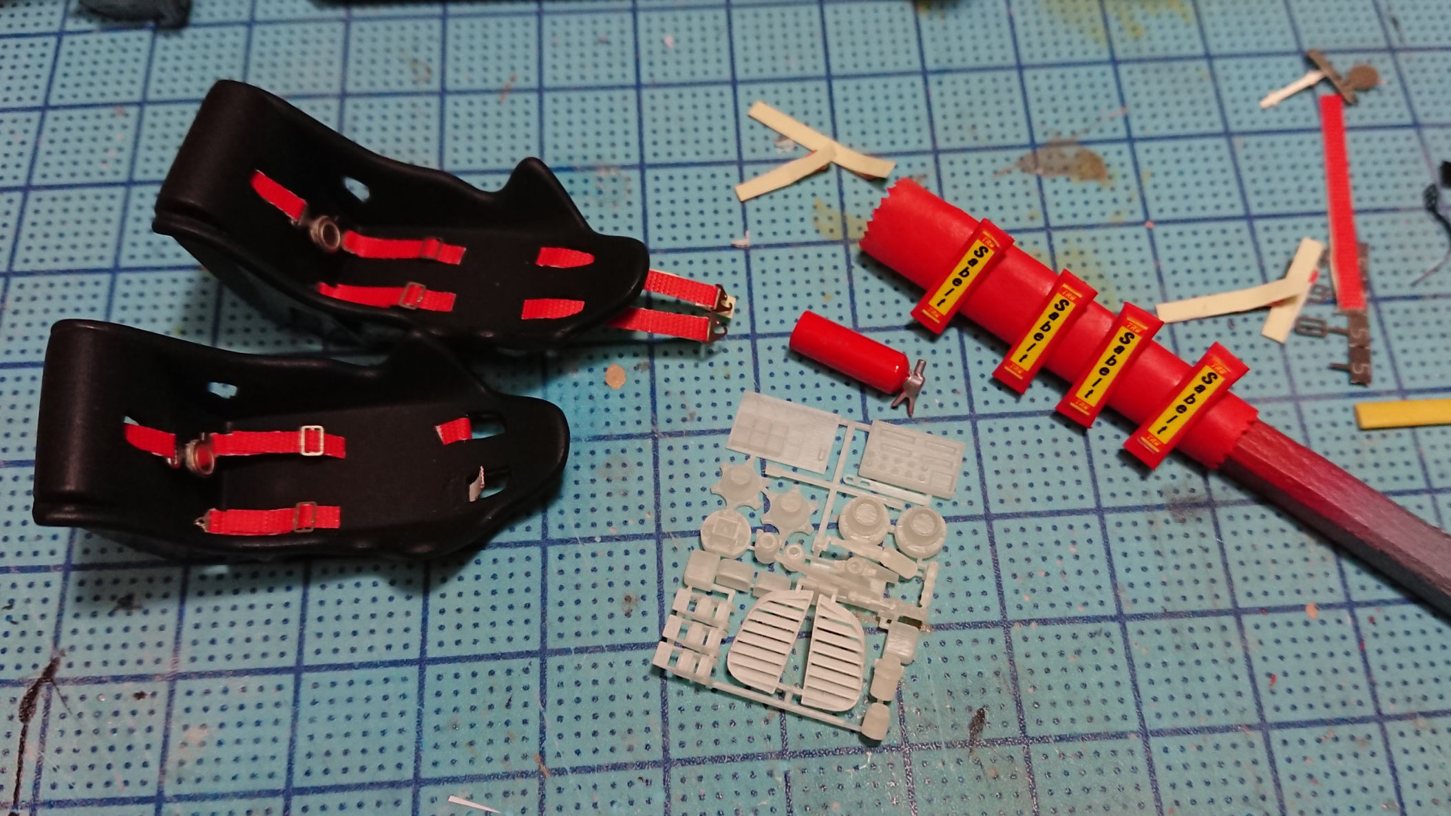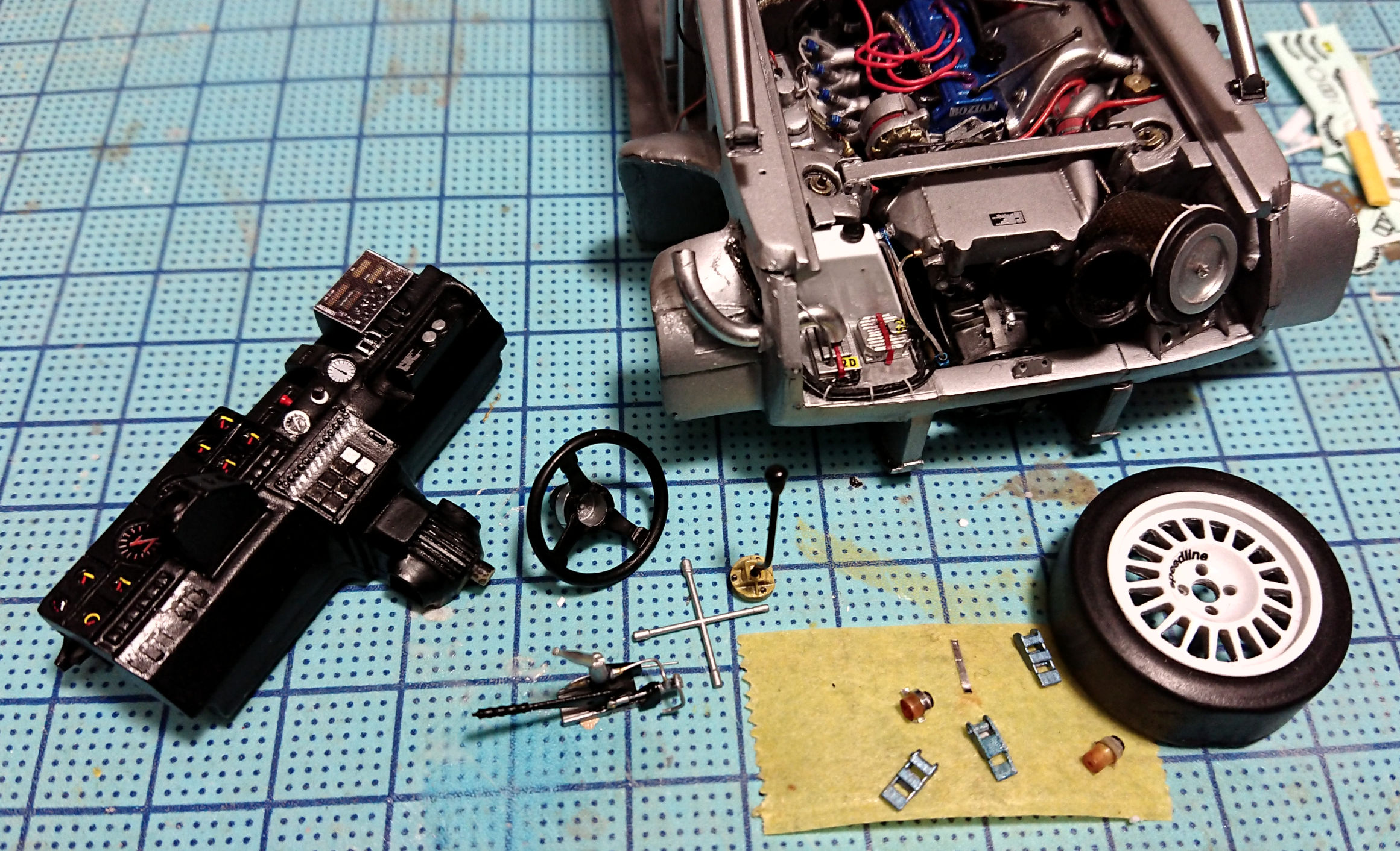 ボディシェルのセットには以下の部品が付きます。グリル,ミラー,リアの補強板,フューエルリッド。グリルはキットのものでは大きすぎて入りませんので,3Dプリンターで作り直してあります。フィンのみ3D出力品そのままです。巨大すぎるキットのミラーを詰めて小型化したプロドライブのミラーも付きます。