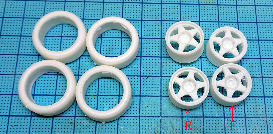 こちらはホイールとレジンタイヤのセット(キットのはなんかスポーク先端が細くって,変なんです)。