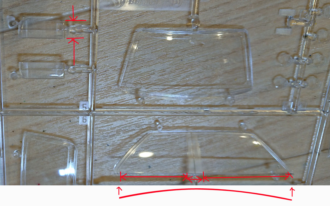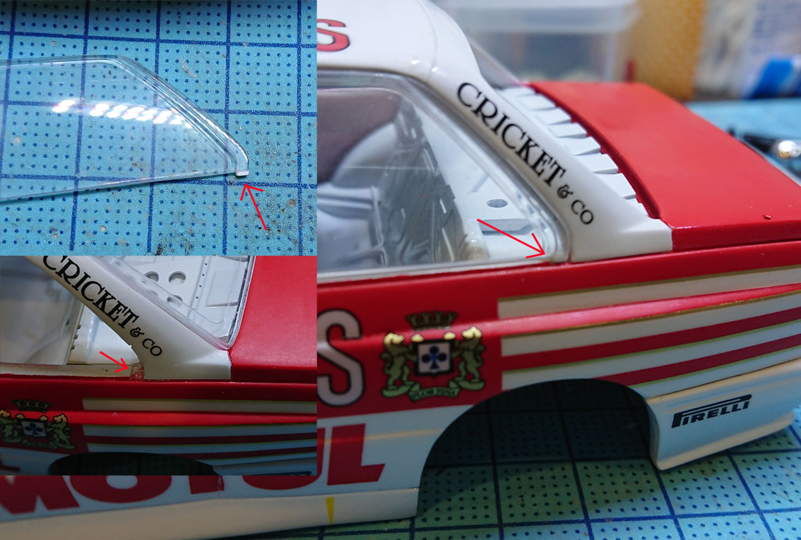 サイドのウィンドウは下辺にあるモールのモールドを削り落とし,磨きなおしてウィンドウを下に拡張します。Bピラー下辺も削ります。マスキングテープを貼って,プラ板に貼ったやすりで削ればそこそこきれいにできるはずです。削り落としたモールドはボディ側にあります。
