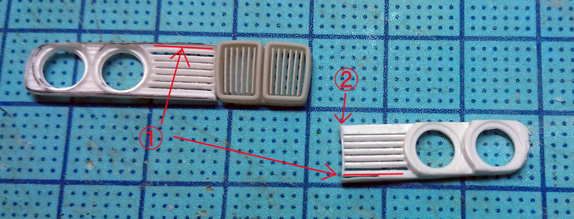 顔の幅を数mm詰めてますのでキットのままでは当然入りません。加工はグリルのモールド部で切断し,①のスリットはエッチング鋸等で切り込みを入れ,上下の幅を詰めます。