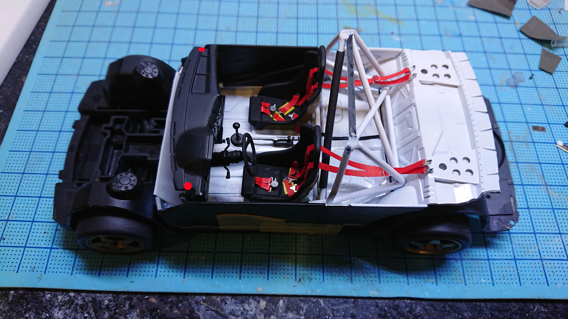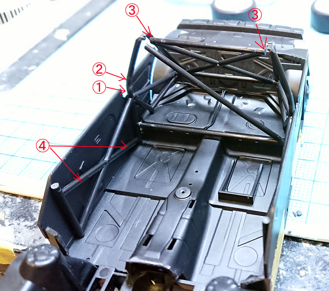 ボディの厚みの都合で,前とルーフのロールバーはカットです。ボディシェル側にモールドしておきました。そして①の箇所の曲がりを強引に戻して直線にしたのち,②の位置で曲げなおします。③の箇所は両側1㎜ずつぐらい切り落とします。ボディの厚みがある関係で,幅詰めが必要なのです。指示してませんが斜行のバーも上を切り取ります。もともとキットのバーの接合順がおかしくて,ルーフのバーとBピラー横のバーが一直線上にないという状態なので,この辺は各自テキトーに接合してください。ルーフはロールバーと少し干渉するくらいになるので,必要に応じて,削り取ってください。