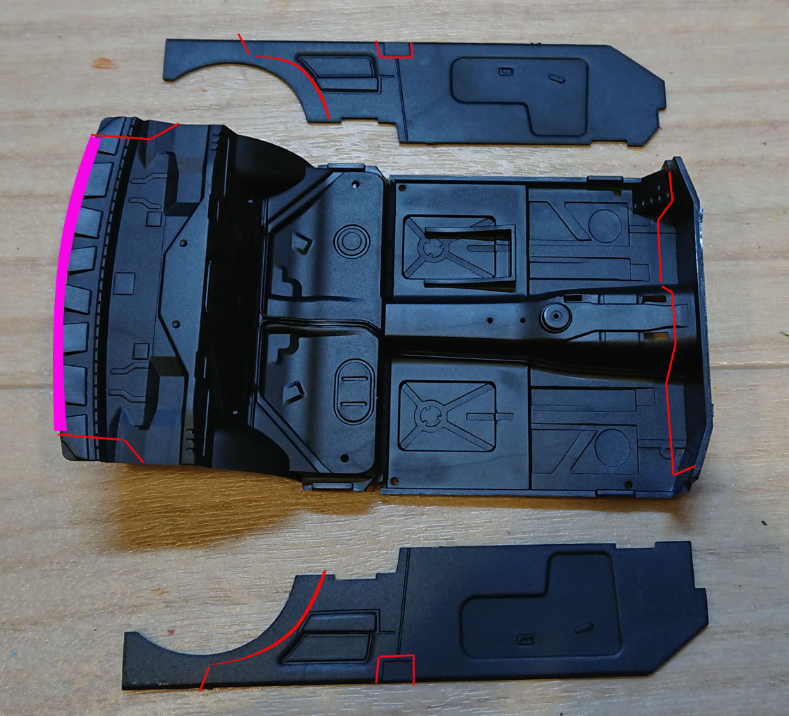 図の赤線から外側部分をカットしてください。ドアの内張の後ろ端はコックピット部品の内側に収まるようにします。リアウィンドの下辺が干渉しますので,紫色の位置は傾斜をつけて削り落としてください。