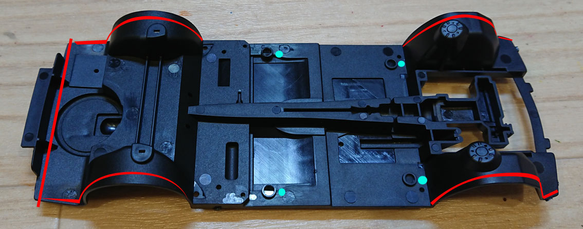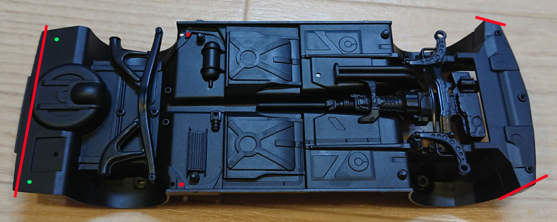 あと前側両脇も少し削ります。タイヤの軸位置は各自で自由にしてもらえばいいのですが,ヒントとしては,フロントは前後はそのまま,リアはサスアームの付け根の位置を5㎜くらい前にあけなおして(赤丸印)前にずらすと大体良いと思われます。ただ,タイヤによってはハウスに干渉しますので,各自調整してください。また,ボディのとの接合は,フロントはキットと同様にひっかけて,後ろは図中の緑丸印の位置でタッピングビスによる固定となります。穴はあけていませんので,実物をフィット後あけてください。